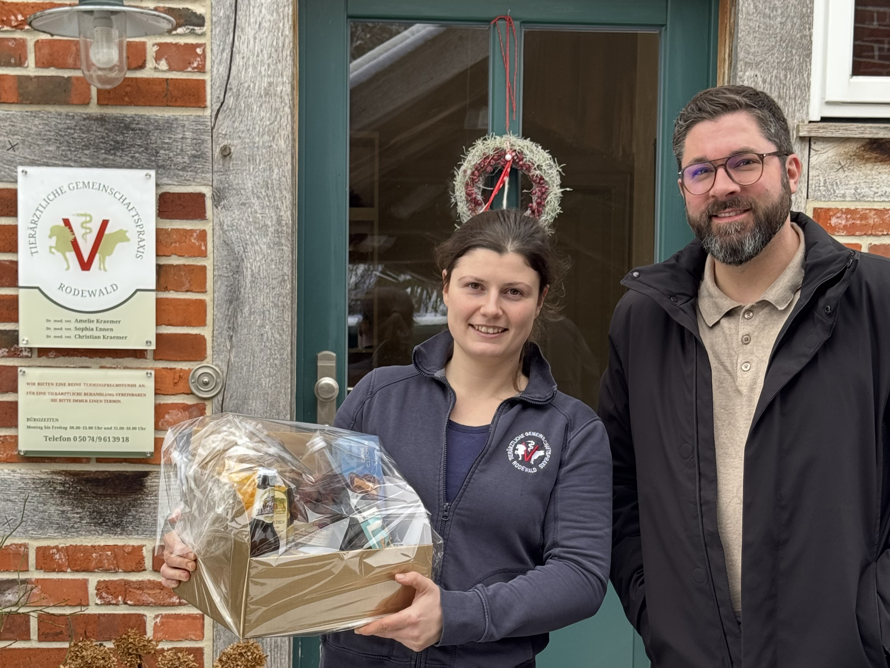 Die Übergabe des Präsentkorbes erfolgte am 27. Januar 2026. Auf dem Foto zu sehen sind Tierärztin Kornelia Langels und der betreuende Veyx-Außendienstmitarbeiter Daniel Becker. Wir wünschen guten Appetit.